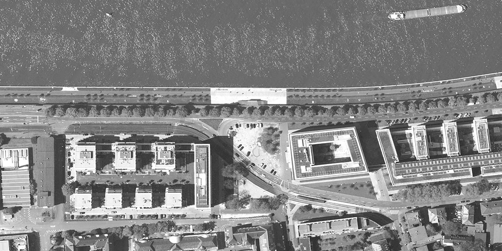 Es war naheliegend, das Mainufer konsequent als Promenade auszubilden und damit dessen hohen Wohn- und Freizeitwert erlebbar zu machen. Das als Parkplatz genutzte Grundstück oberhalb der Tief-Kai-Anlage zwischen Klinik und dem Verwaltungsgebäude der Allianz war eine der letzten Lagen am innerstädtischen Mainufer, die für eine neue zusammenhängende Wohnbebauung zu Verfügung standen. Die versetzte Anordnung der sieben solitärstehenden Wohnhäuser in zwei Reihen auf jeweiligem Sockelgeschoss ermöglicht eine hohe bauliche Dichte, ohne die Offenheit des Ortes, seinem Bezug zum Wasser und die Orientierung zur Frankfurter Skyline, zu verbauen. Sämtliche Wohnungen haben großzügige Balkone oder Terrassen mit vielfältigen Ausblicken in die weite Umgebung, nach Süden hin bis zum Stadtwald. Zwischen den aufgereihten Häusern konnte eine großzügige und zum Teil privat genutzte Gartenanlage entstehen.